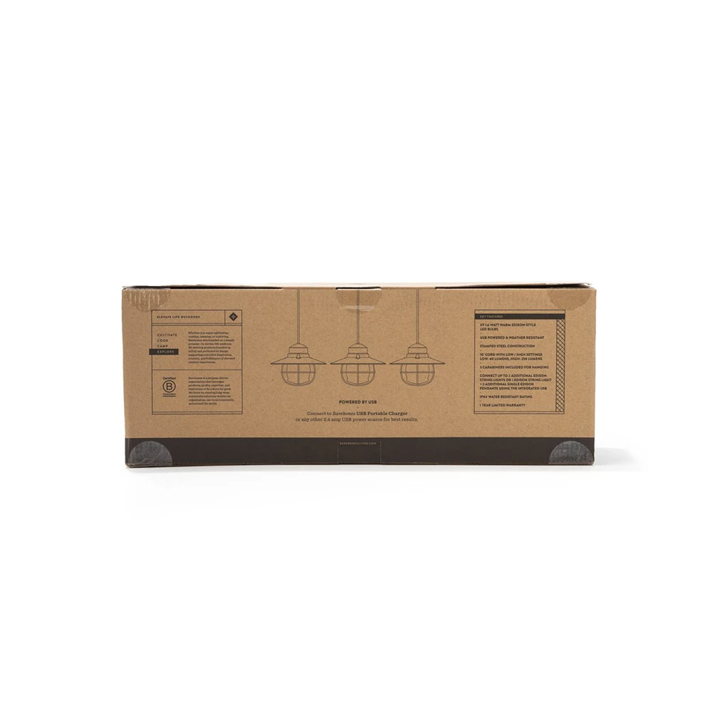 Add illumination and ambiance whether you’re off the grid or in the heart of the city. The Edison String Lights make it simple to style your outdoor space. Three LED Edison lights connect by a single cord to make for easy hanging and styling. Connect up to two Edison String Light sets together for brighter appeal. Note: lights must be powered by a USB charger port.