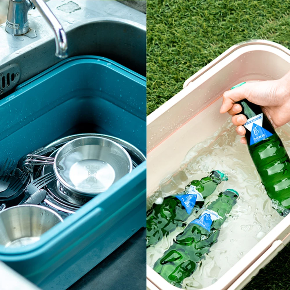 This is a multi purpose container with large capacity storage. The container lid can be used as a simple table, after use crush it with the basket and carry it compactly. It also can be used as a sink to cool the drinks by adding ice or washing dishes.