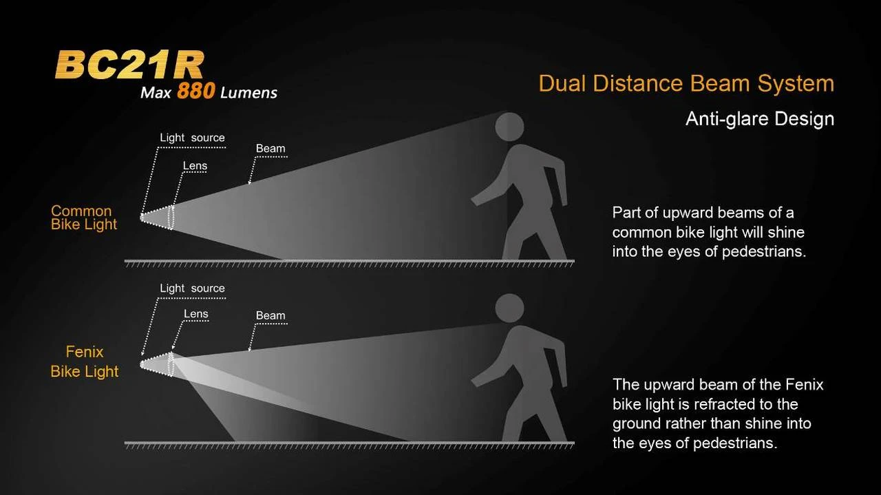 Flexible Power Application with Carry-on Convenience! The new Fenix BC21R Rechargeable Bike light is an integrated yet versatile bike light which delivers a maximum 880-lumen neutral white light. The BC21R features four output modes plus Flash to enhance your cycling activities. The built-in side red light assists in riding safety. The quick-release bike mount makes it easier to mount or dismount the light. Because the BC21R is powered by one standard 18650 rechargeable battery or two non-rechargeable CR123 battery, you can easily dismount the light, change the batteries, then continue on those long rights. This well-designed bike light goes anywhere for any activity. Perfect for road racing, bicycle riding, and urban commuting.