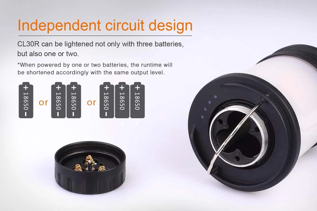 - Powered by one, two or three 18650 rechargeable Li-ion batteries