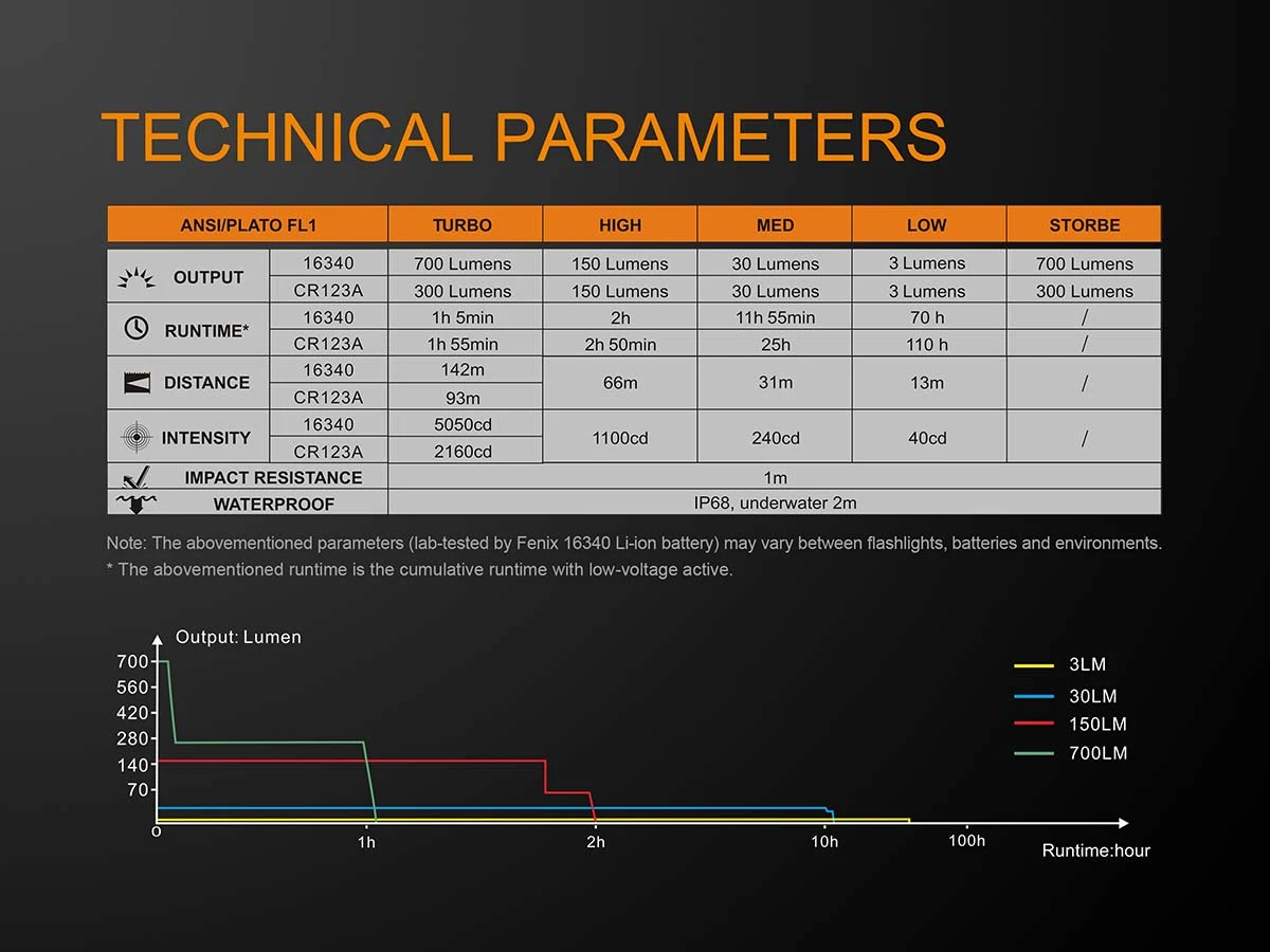 - Battery (not included): One 16340 Li-ion battery or one CR123A battery