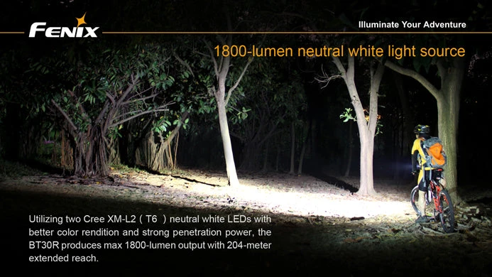 BT30R rechargeable bike light is what you bring to a mountain bike descent. With an ultra-compact headlight, the water-resistant BT30R features two neutral white LEDs of better color rendition, 1800-lumen output with remote burst activation and exclusive Dual Distance Beam System to help you see further and go faster even through rain and fog.