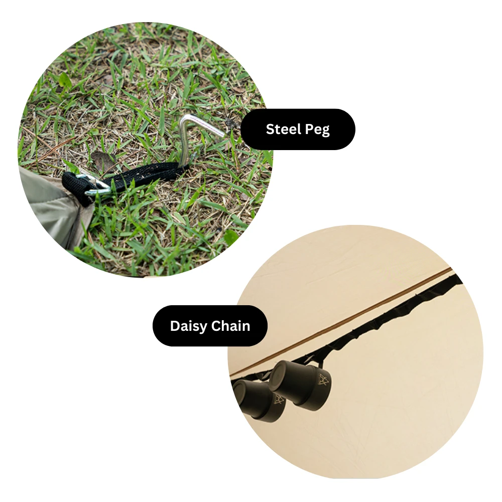 • Component : Main tent, Inner tent, Full ground sheet, Daisy chain, 8x Peg, 2x Strings, Storage bag