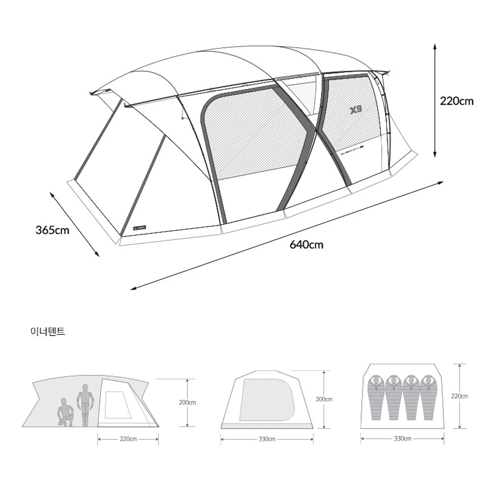 - Dimension: Upon installation – 640 x 365(H) x 220 CM | Storage – 80 x 35(H) x 35 CM | Inner tent – 330 x 220 x 200 (H) CM