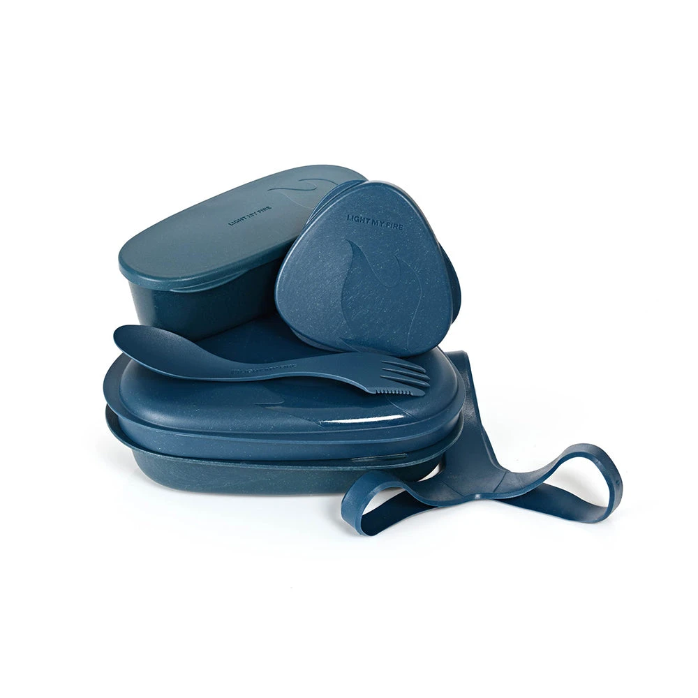 All you need to bring your own, eat in style, and pack away again. Designed especially for Light My Fire by Scandinavian design Joachim Nordwall, the LunchKit BIO is a handy all-in-one meal kit, perfect for lunch or a snack. The kit includes 1 lid that functions as a plate (500 ml), 1 deep bottomed bowl that also function as a plate (900 ml), 1 SnapBox Original (170 ml) food storage container, a SnapBox Oval (320 ml) storage container, and 1 Light My Fire Spork Original. It also includes a harness to keep the kit all together. Tight-fitting, snap-lock lids keep contents inside the waterproof SnapBoxes instead of all over your bag. This mess kit is especially versatile thanks to the Light My Fire Spork Original that’s a spoon-fork-knife combo. The beauty of this kit is that it all nests inside itself for a compact and transportable meal on the go. Lastly, all components are dishwasher and microwave safe, and are made from Biobased plastics that are 100% BPA-free. This makes the kit versatile to use as a lunchbox for school or work.