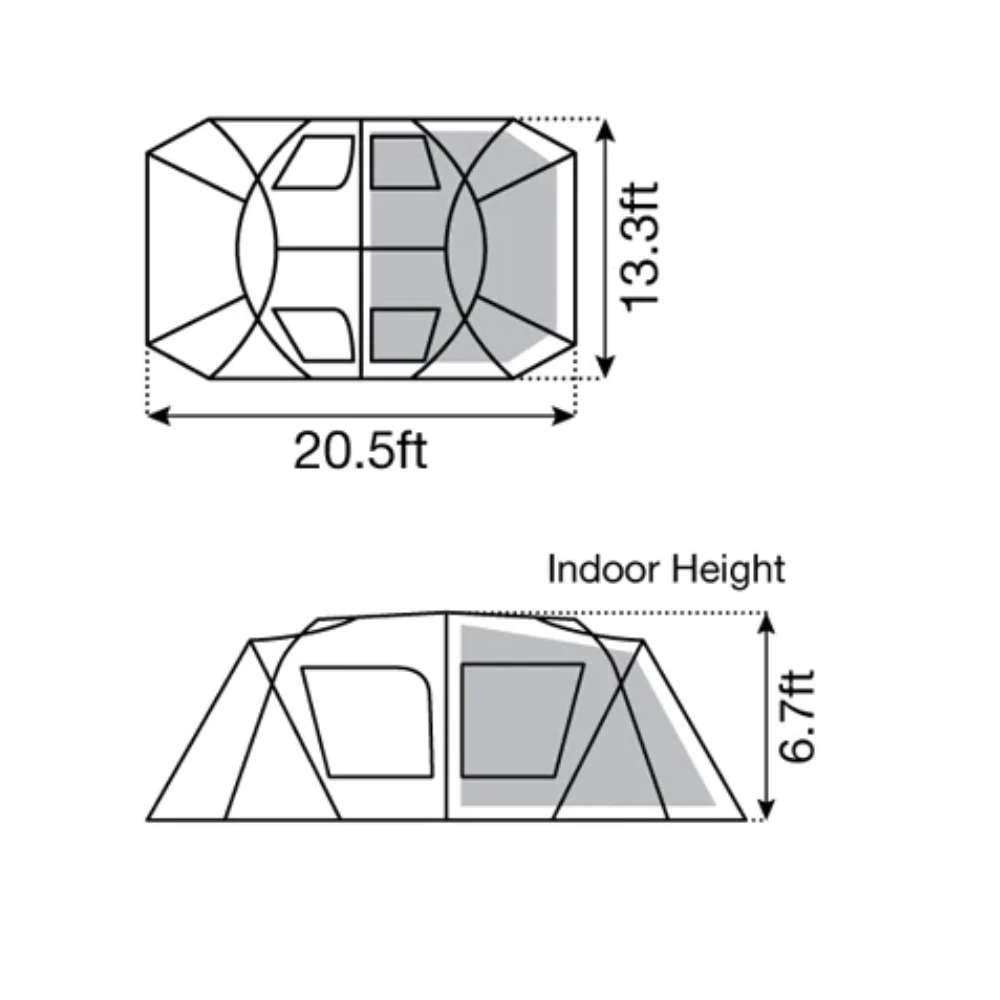 - What’s in the bix: Fly sheet, Inner tent, Roof Cheet, 2x A Frame, 2x C Frame, Center frame, Ridge pole,