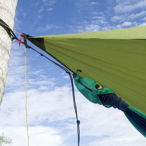 The MoonTarp is designed to be used with all Ticket To The Moon hammocks (except the Mammock), but it can also be used alone or with most other hammocks. It measures 350 cm x 350 cm and covers 12m² of surface. It is made of nylon Ripstop treated PU which ensures an effective protection against the weather (Waterproof2000 mm). For better protection, it has ergonomic drip lines. This tarp is simple and quick to put in place thanks to its 8 points of inking (shrouds and aluminum buckle.