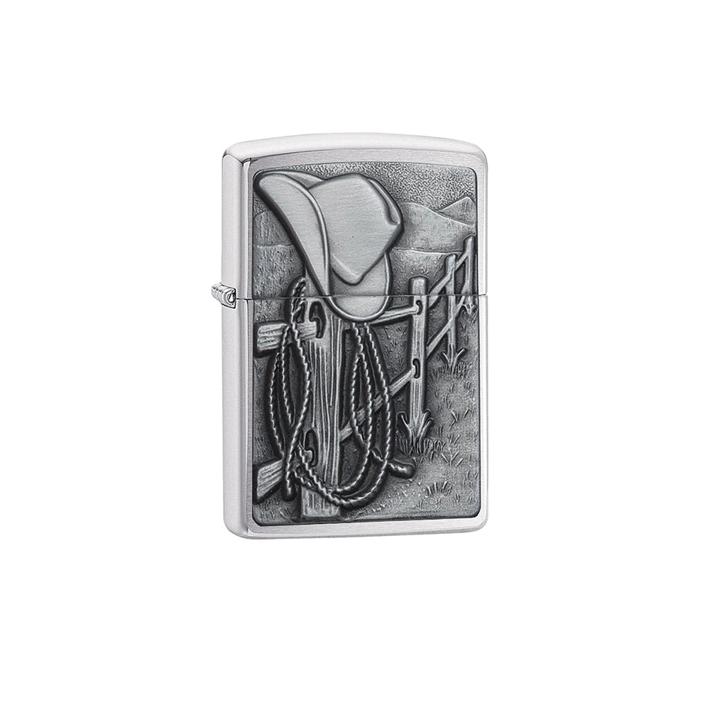 This Brushed Chrome windproof lighter has a emblem attached with a western scene.